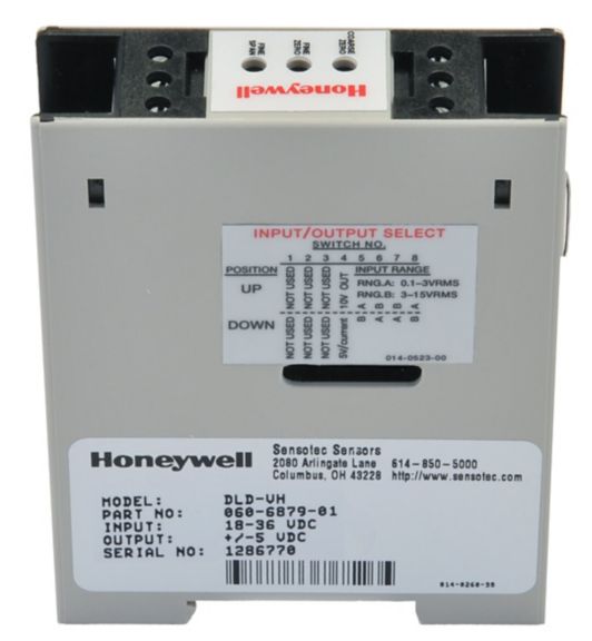 DIN rail mount ac displacement inline amplifier. ±5 Vdc or ±10 Vdc field-selectable output.