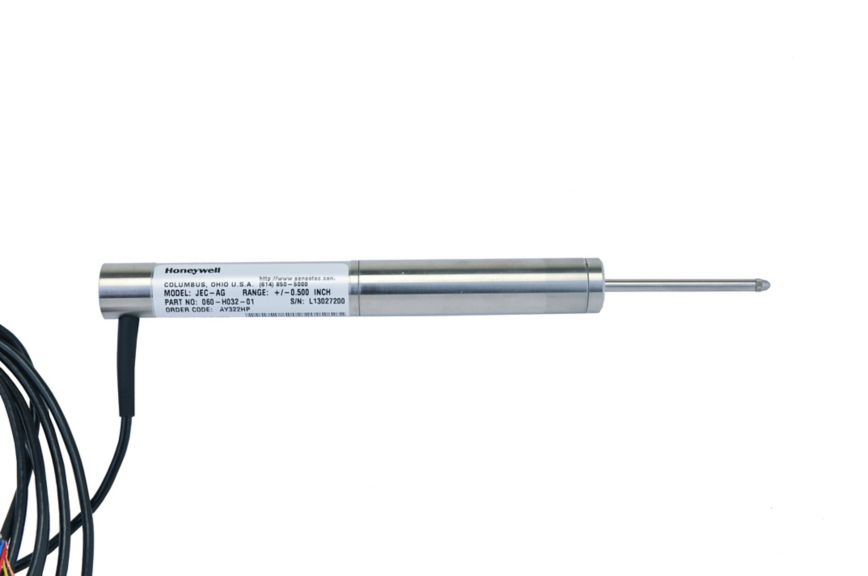 Model JEC-AG DC-DC Long Stroke Displacement Transducer with captive guided spring return armature, ranges from ± 0.5 to ± 3.0 in and an accuracy of ± 0.25% of full scale. Output of either ± 5 vdc or 0 to 10 vdc with supply that can operate with either a dual power supply of ± 12 vdc to ± 20 vdc or a single power supply of 24 to 40 vdc. Unit can operate from a temperature of -58°F to +176°F and is constructed with a stainless steel body and has a 6 ft long multiconductor shielded cable.