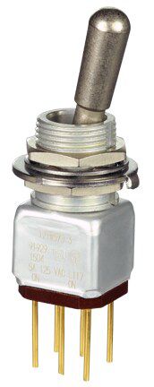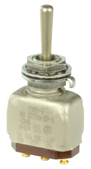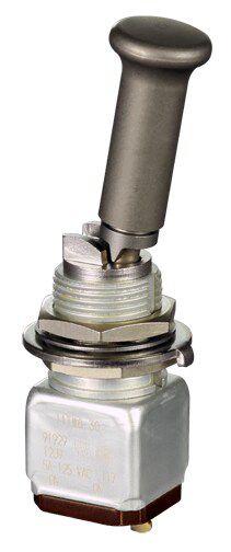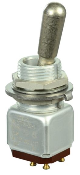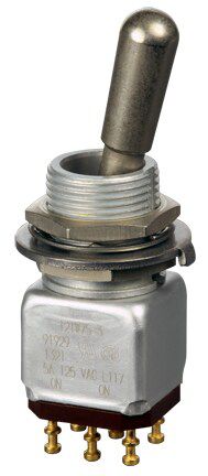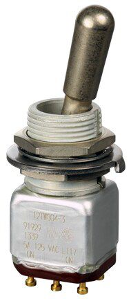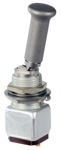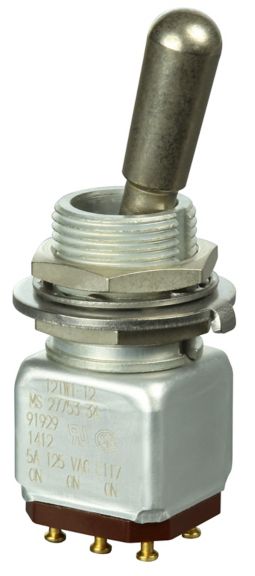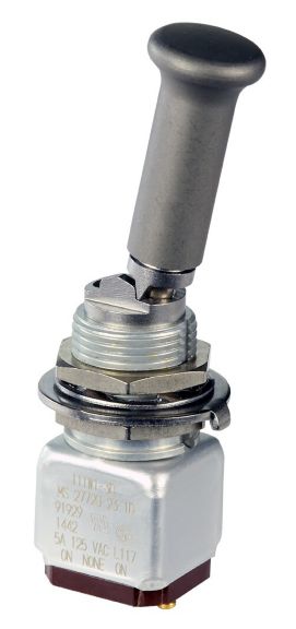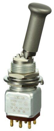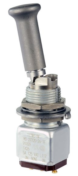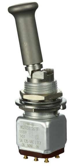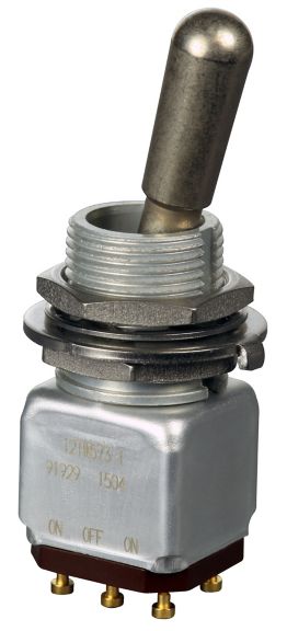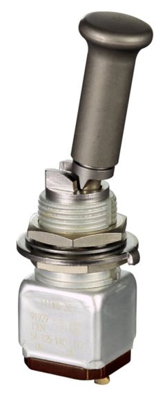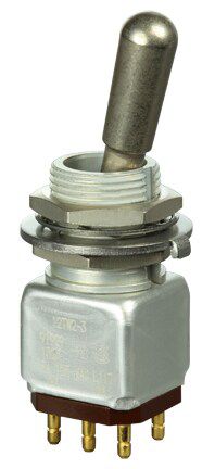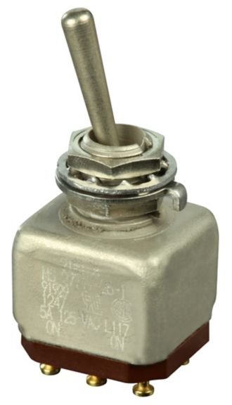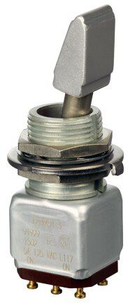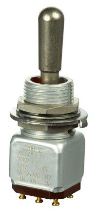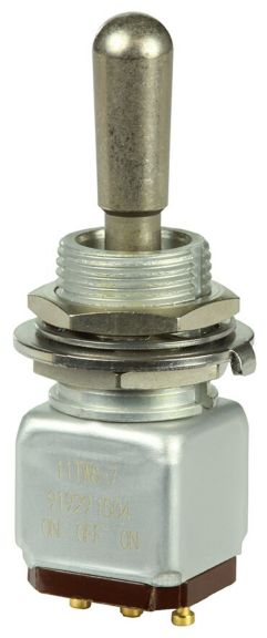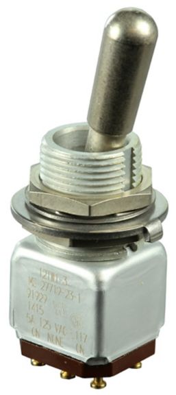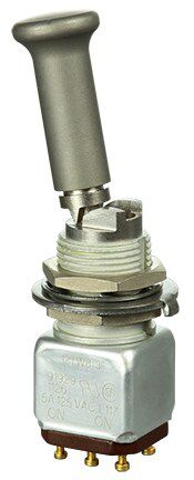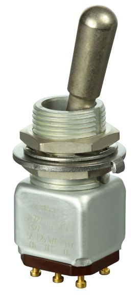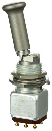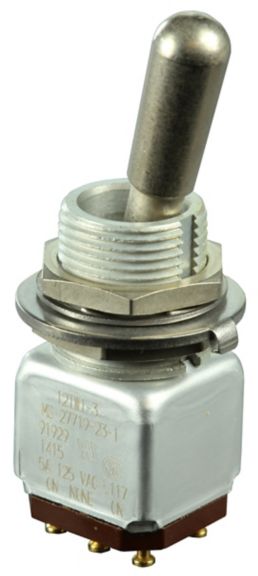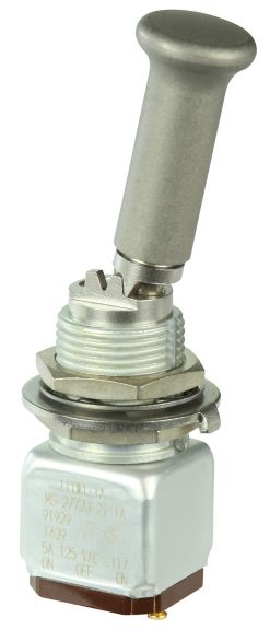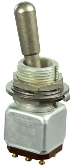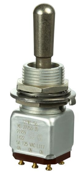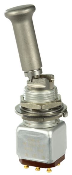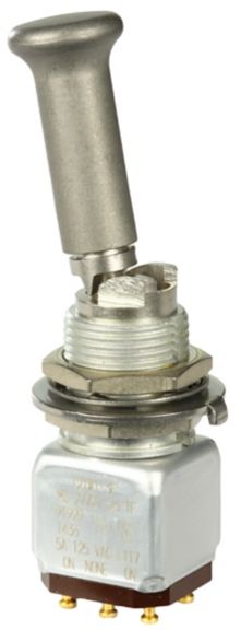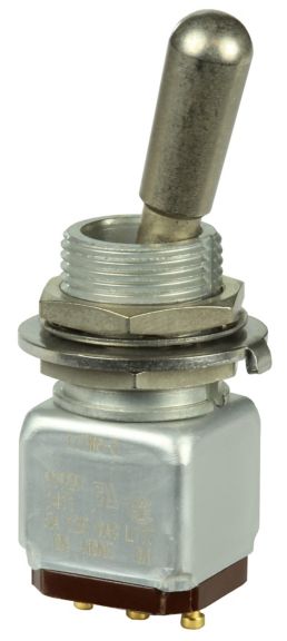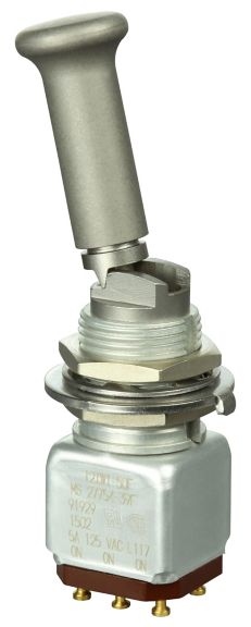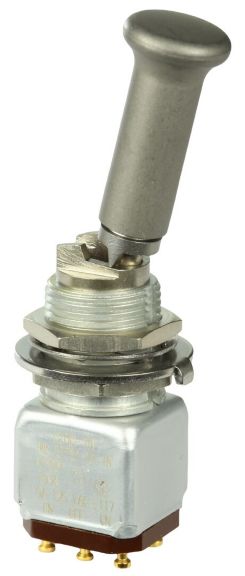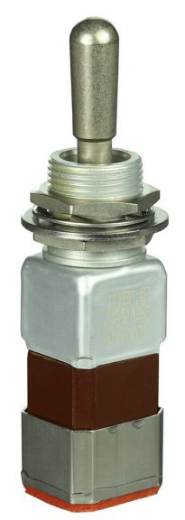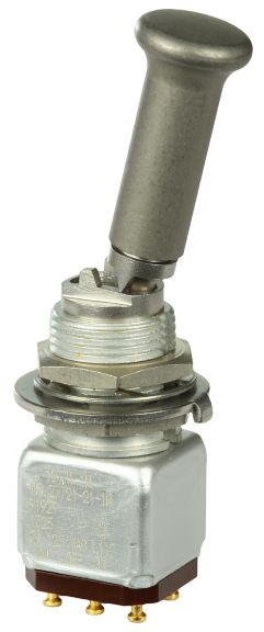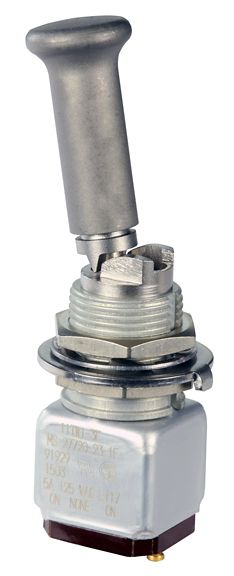 Miniature stainless steel toggle. UL, MIL-DTL-83781. 0.1 A to 5 A. Variety of actuators, actions, terminations, and circuitries.