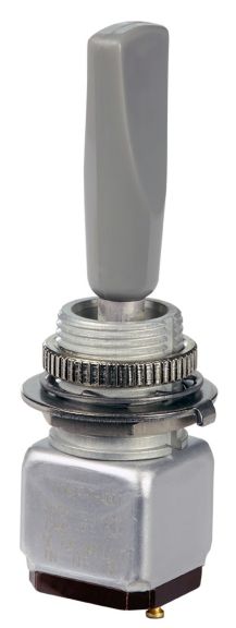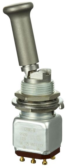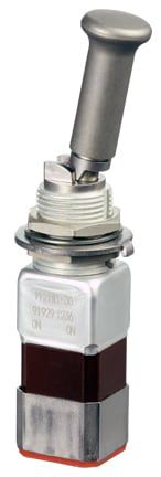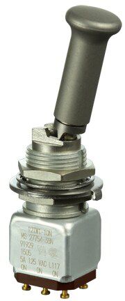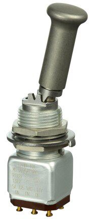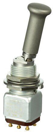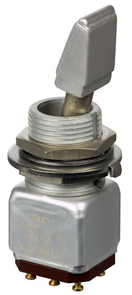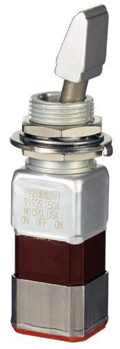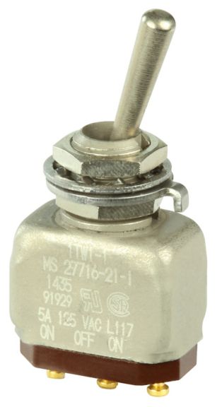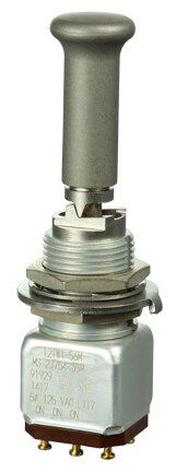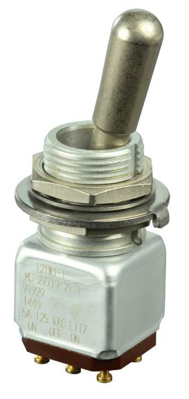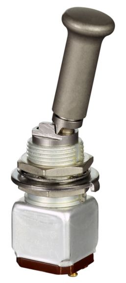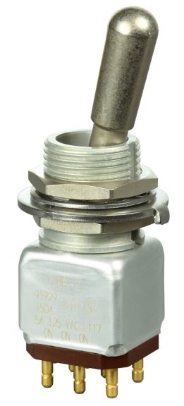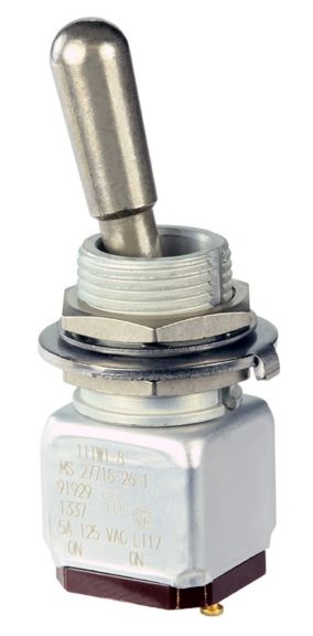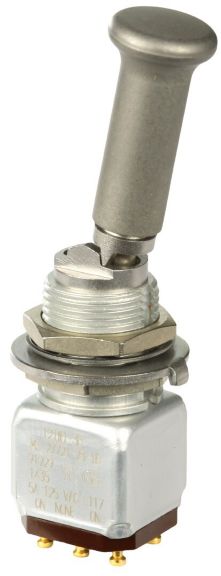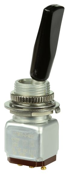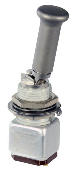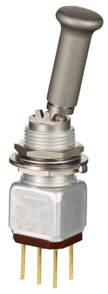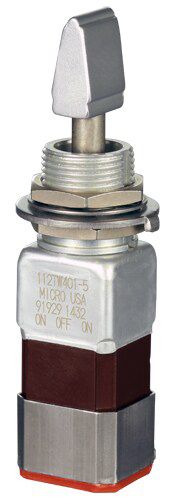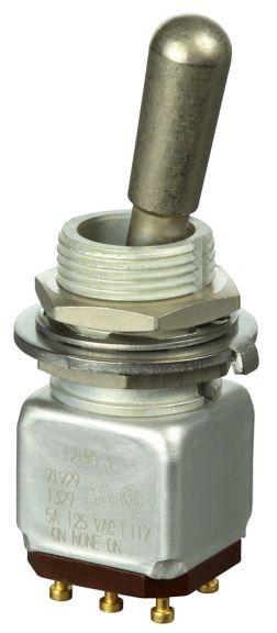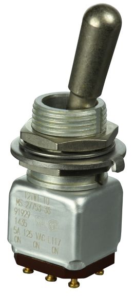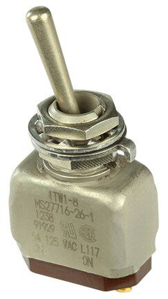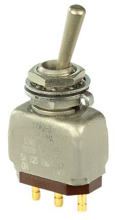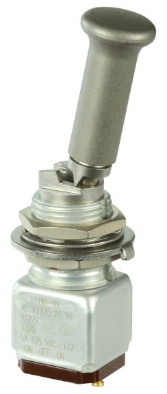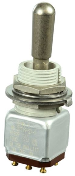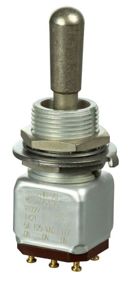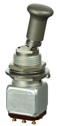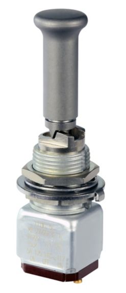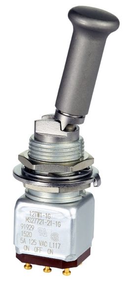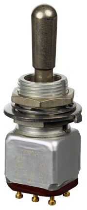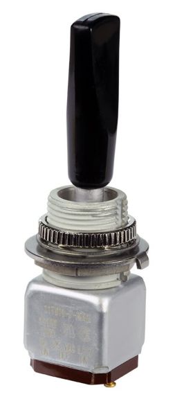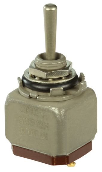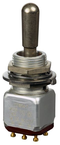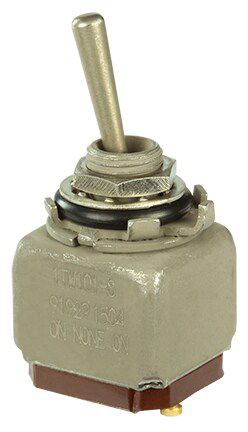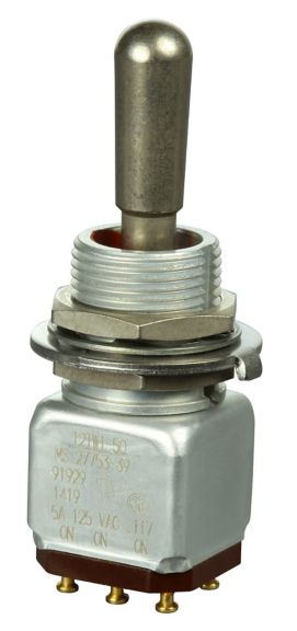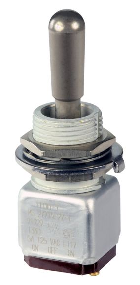 Miniature stainless steel toggle. UL, MIL-DTL-83781. 0.1 A to 5 A. Variety of actuators, actions, terminations, and circuitries.