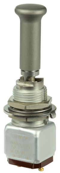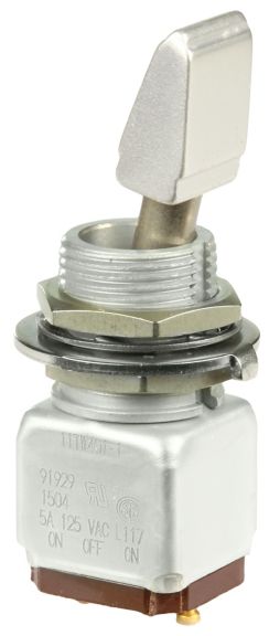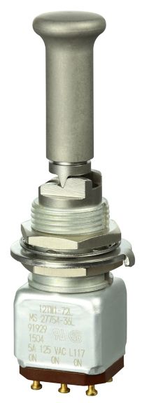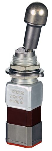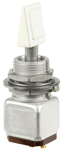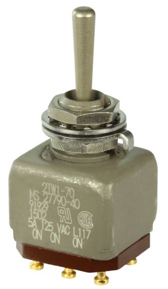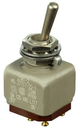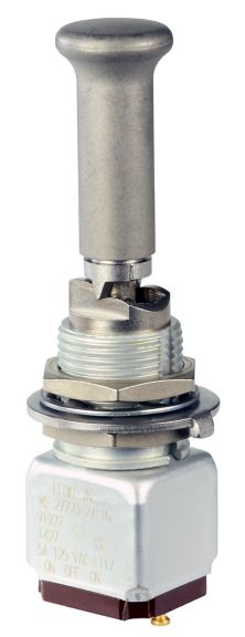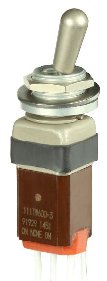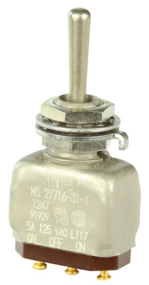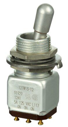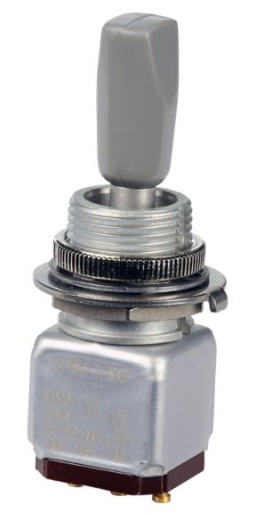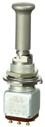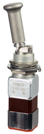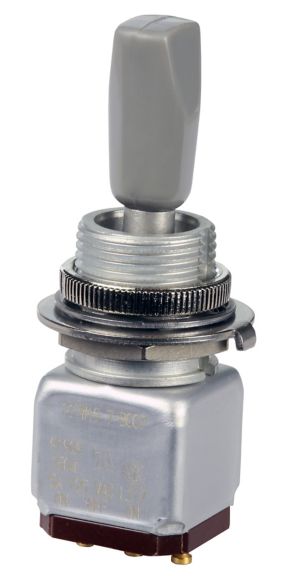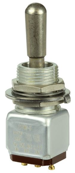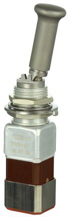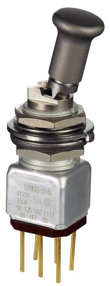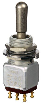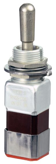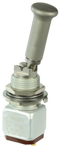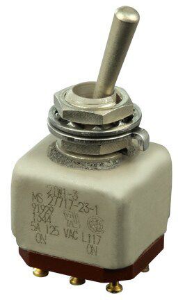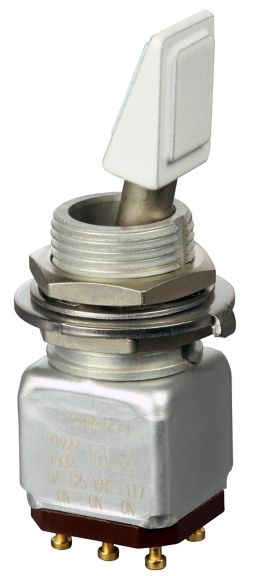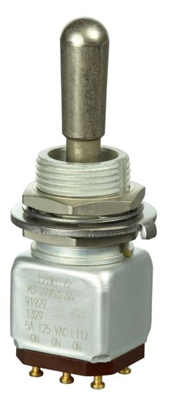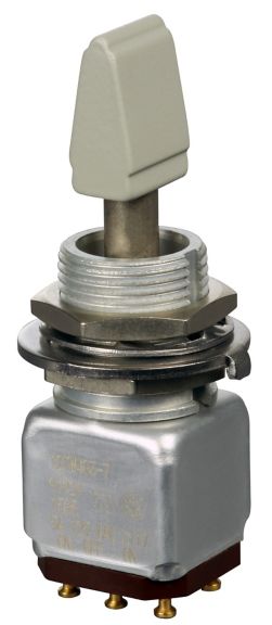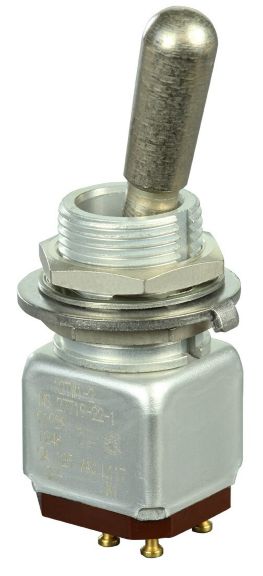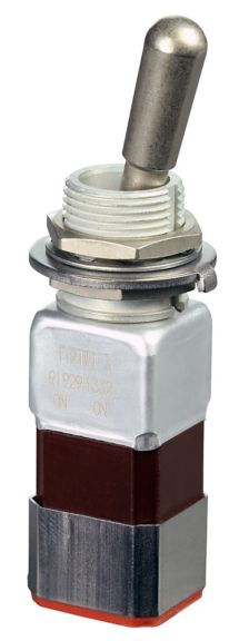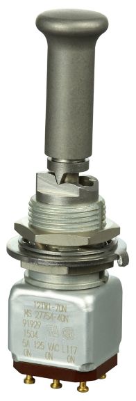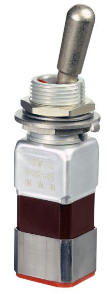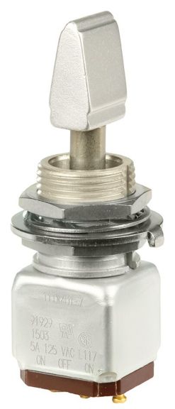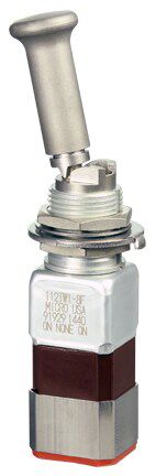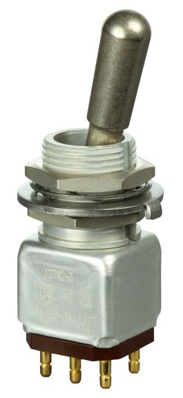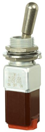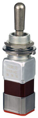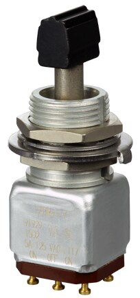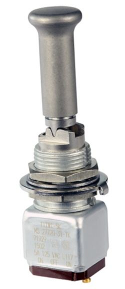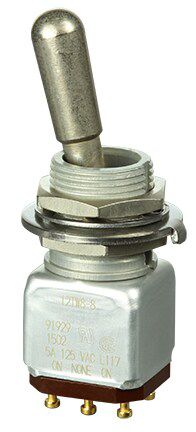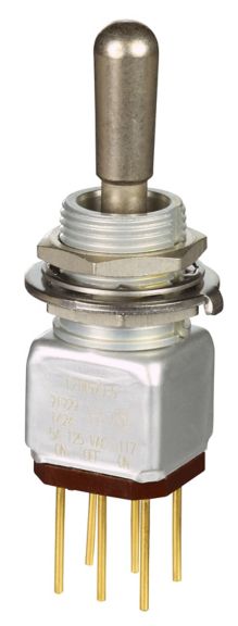 Miniature stainless steel toggle. UL, MIL-DTL-83781. 0.1 A to 5 A. Variety of actuators, actions, terminations, and circuitries.