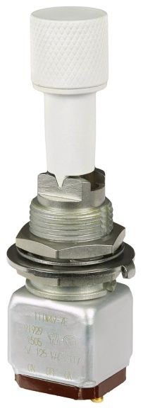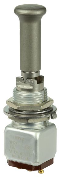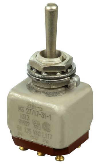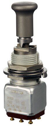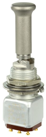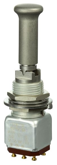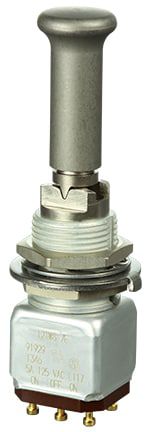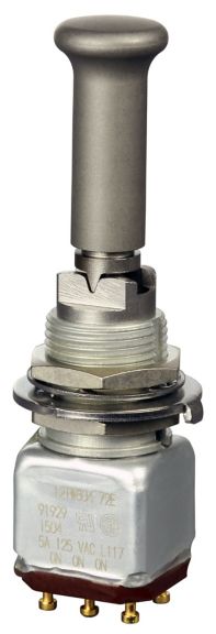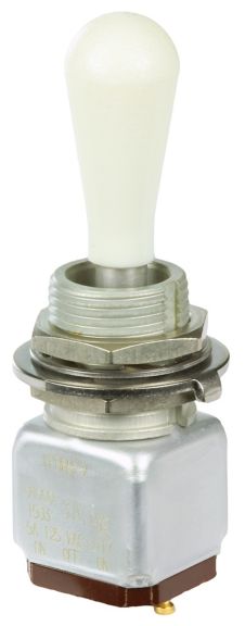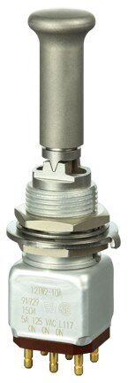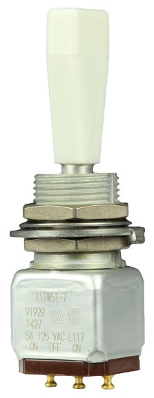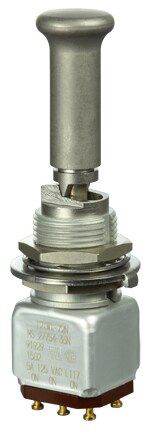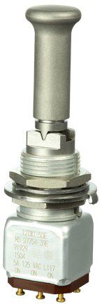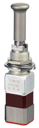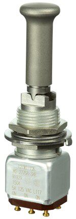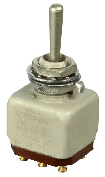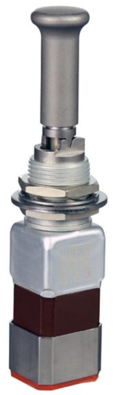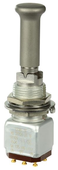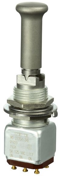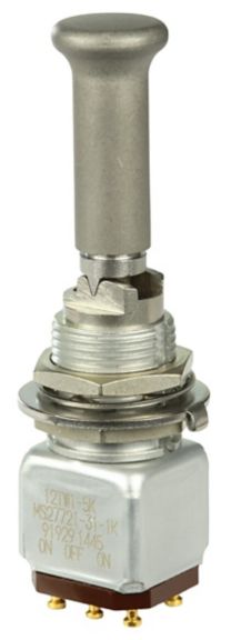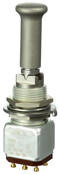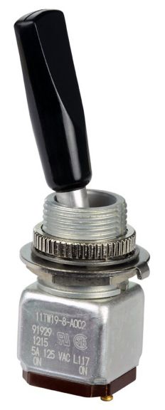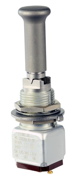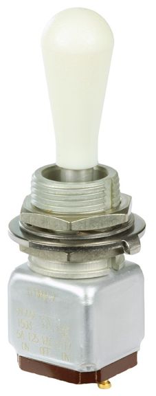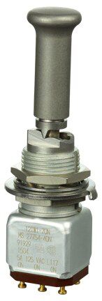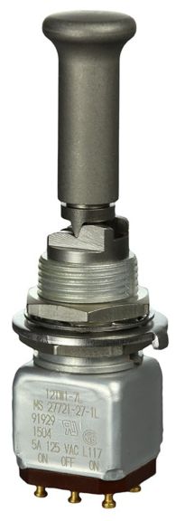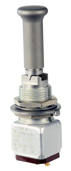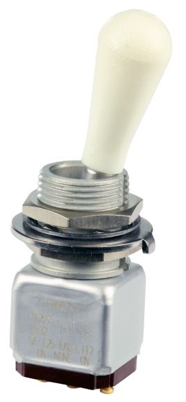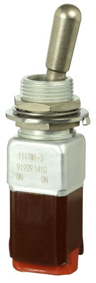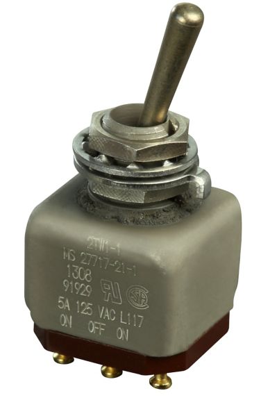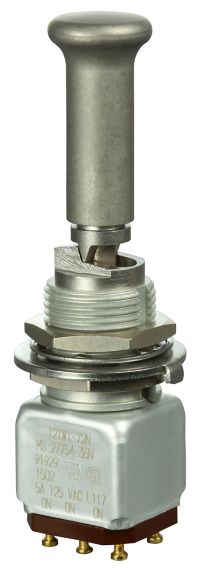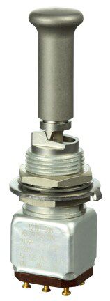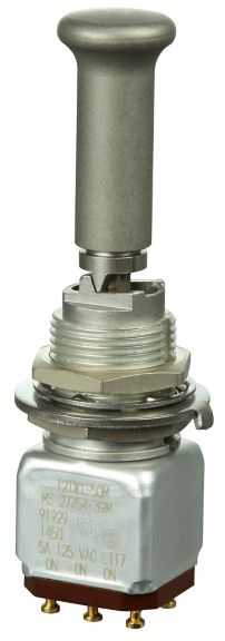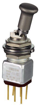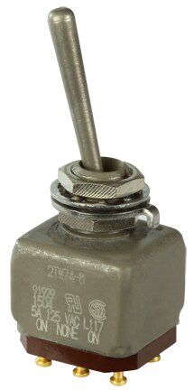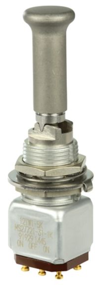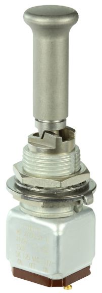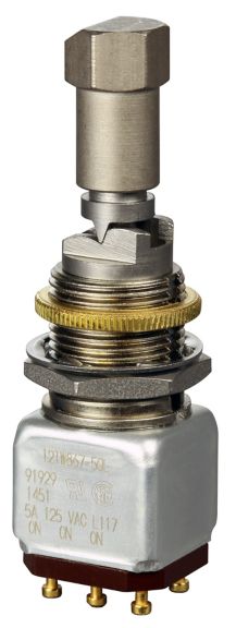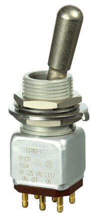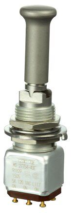 Miniature stainless steel toggle. UL, MIL-DTL-83781. 0.1 A to 5 A. Variety of actuators, actions, terminations, and circuitries.