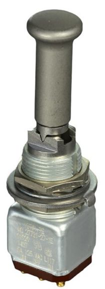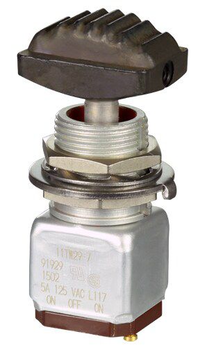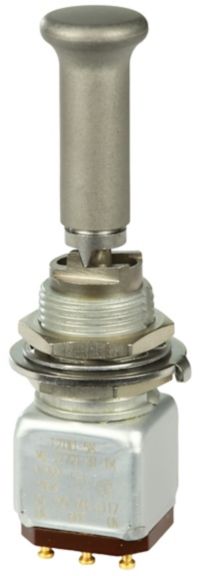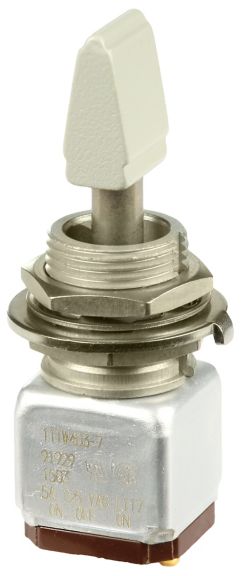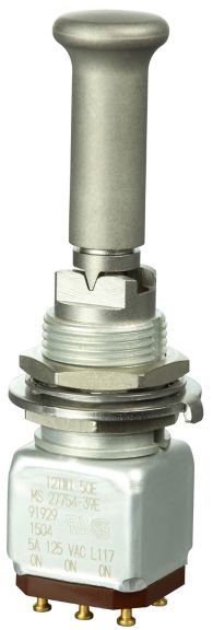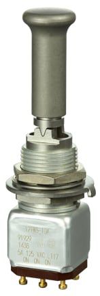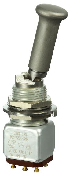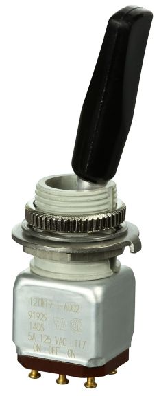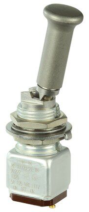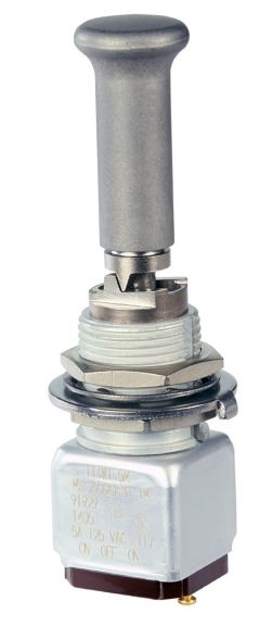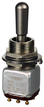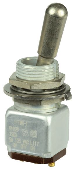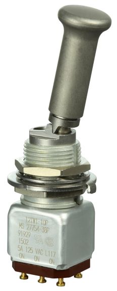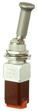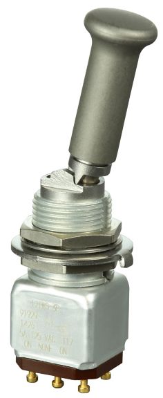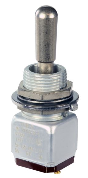 Miniature stainless steel toggle. UL, MIL-DTL-83781. 0.1 A to 5 A. Variety of actuators, actions, terminations, and circuitries.